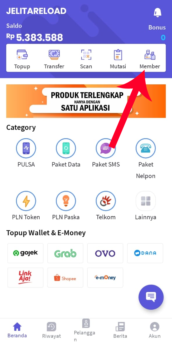 Cara mendaftarkan downline, selain menggunakan format daftarkan downline yang dikirim melalui SMS, WhatsApp, Telegram, dan juga sistem Autoreg, Anda juga bisa mendaftarkan downline melalui link referral yang diarahkan langsung ke aplikasi android. Link referral bisa didapatkan di aplikasi android akun anda. Klik “Member” di sisi kanan atas, di bawah hasil Bonus. Lalu, klik “Link Member” untuk mendapatkan link referral. Setelah masuk di halaman “Link Member“, klik tanda “Tambah ( + )” di pojok kanan bawah. Kemudian isi “Nominal Mark Up“ sesuai dengan keinginan Anda, misalkan 50, lalu klik “Tambahkan“.